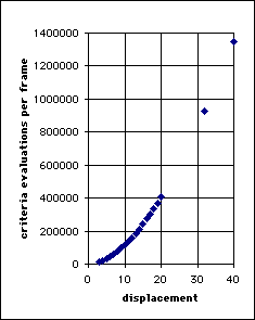 Number of criteria evaluations per frame for exhaustive search as the maximum displacement increases.