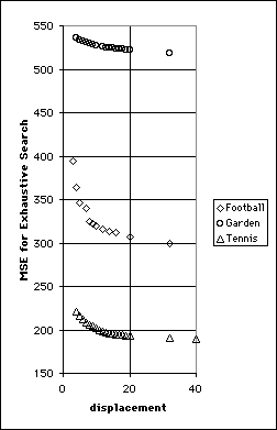 The exhaustive search behaved very much as expected and little new knowledge was gleaned from these experiments. The MSE values for each displacement are very useful as best cases, by which to compare the quality resulting for other BMAs operating on the same sequence and search area.